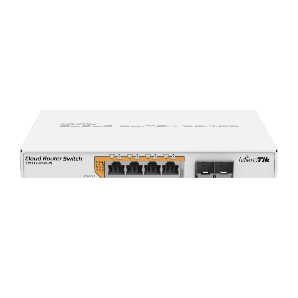 8x Gigabit Ethernet Smart Switch with PoE-out, 4x SFP cages, 400MHz CPU, 128MB RAM, desktop case, RouterOS L5.The CRS112-8P-4S-IN is an 8-port Gigabit PoE switch with auto-sensing 802.3af/at and Passive PoE support, plus four SFP ports for fiber uplinks up to 1Gbps. It features 12 independent switching ports, a built-in 28V power supply, and a secondary DC input for 48-57V power. With flexible power options and reliable performance, it’s ideal for diverse networking setups.