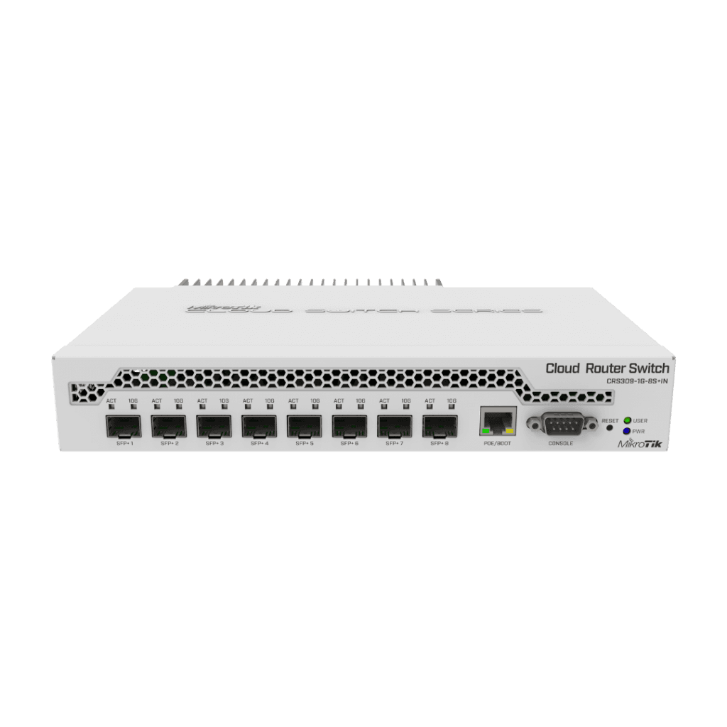 The CRS309-1G-8S+ is a compact yet high-performance switch featuring eight 10G SFP+ ports, delivering up to 162 Gbps switching capacity and 81 Gbps non-blocking throughput. It includes a dual-core 800 MHz CPU, 512 MB RAM, a management Ethernet port with PoE input, and dual boot support for RouterOS or SwOS. Ideal for high-speed, space-conscious networking setups.