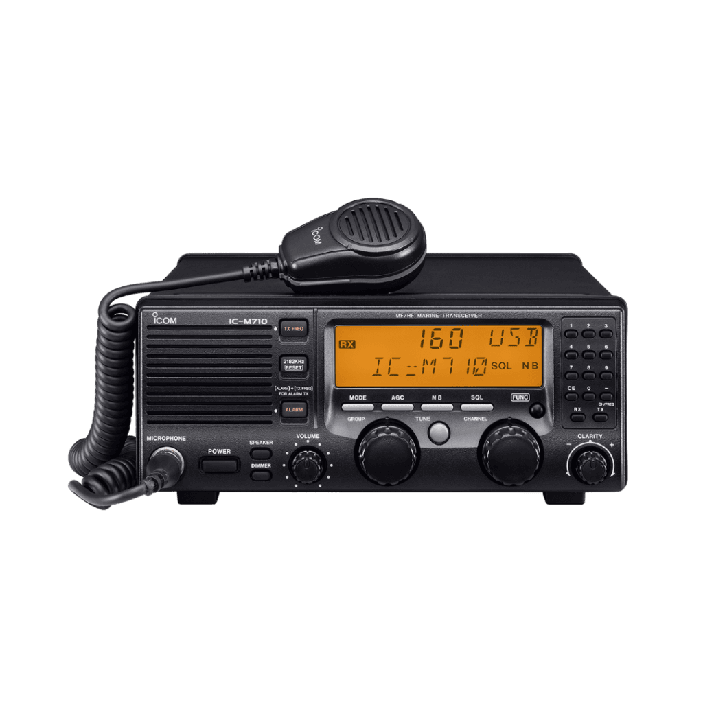 The ICOM IC-M710 is a robust MF/HF marine transceiver engineered for reliable long-distance communication on the open sea. With a powerful 150 W (PEP) output, it ensures clear, consistent transmission even in challenging marine environments. Its automatic antenna tuning function simplifies setup, making it ideal for both experienced operators and everyday users. The durable die-cast aluminum chassis and surface-mount technology enhance performance and longevity in harsh conditions. Featuring an intuitive alphanumeric readout, the IC-M710 offers both ease of use and high functionality for serious marine communication needs.